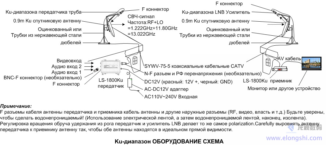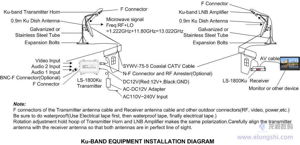 Ku波段0.45米偏饋天線,以及發射頭和接收高頻頭安裝: